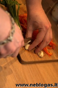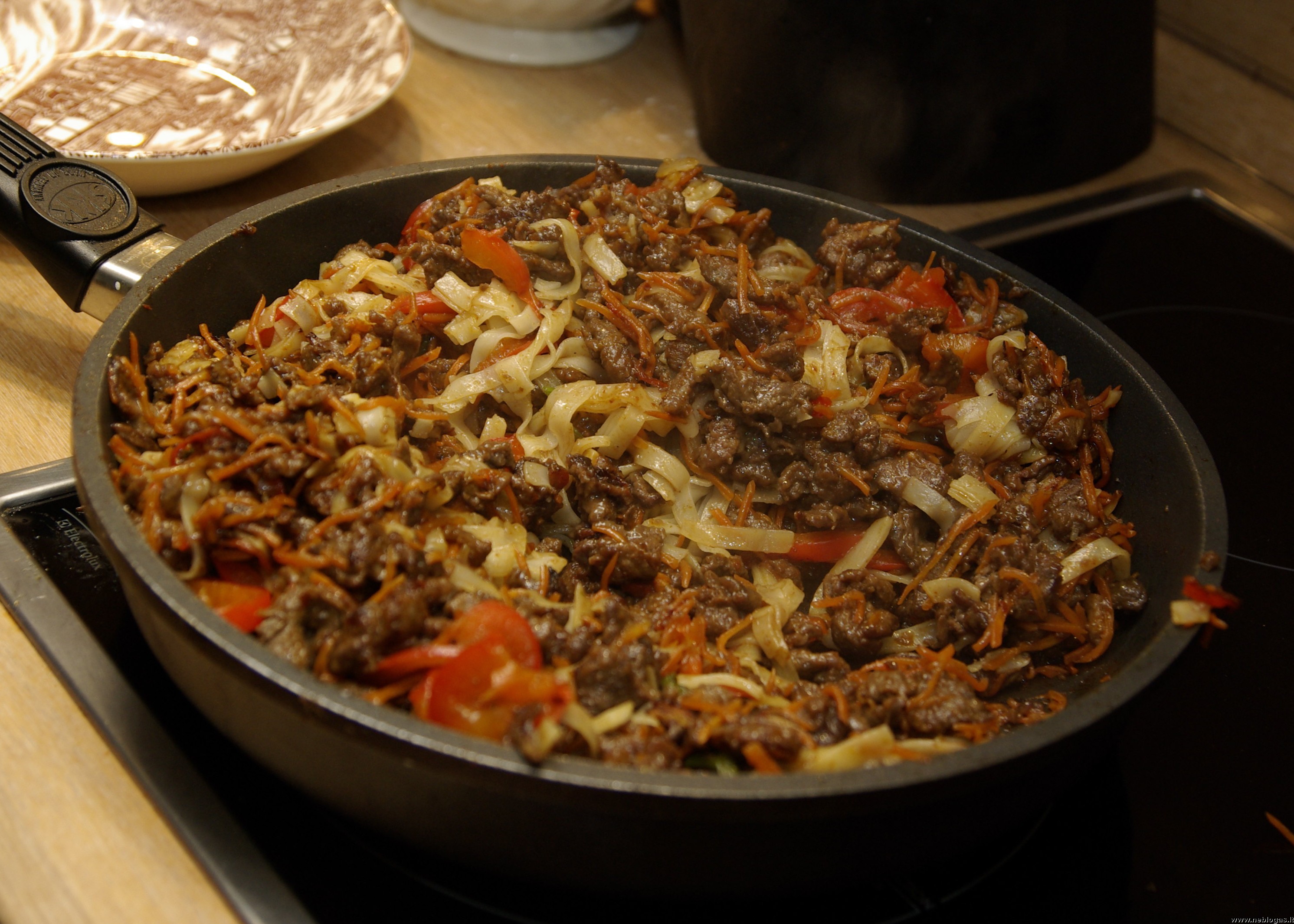 Mėsą apibarstome prieskoniais (juodieji, baltieji pipirai, kalendra, raudonosios aštrios ir saldžios paprikos, nedidelis žiupsnelis druskos). Paliekame pastovėti kokią valandą. Tuo tarpu taip pat plonai supjaustome saldžiąją papriką ir sutarkuojame kelias morkas plonais šiaudeliais.