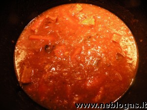 Kai porai pasidaro minkšti ir išleidžia sultis, sudedame atgal mėsą, dedame lauro lapelį, šaukštelį grūstų juodųjų pipirų, pusantro litro jautienos sultinio, šaukštą pomidorų pastos ir keletą smulkinto česnako skiltelių.