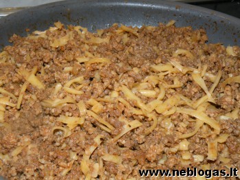 Sutarkuojame kokį 200g Čedario sūrio. Sumaišome su atvėsusia mėsa.