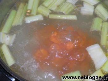 Stambiai supjaustome 3 saliero stiebus, 3 morkas. Pakepiname puode ant sviesto kartu su lauro lapu, smulkinto česnako skiltele ir keliais juodais pipirais. Užpilame pora litrų vandens, įdedame druskos, įmetame nuluptą, bet nepjaustytą svogūną. Verdame ant neaukštos ugnies apie valandą.