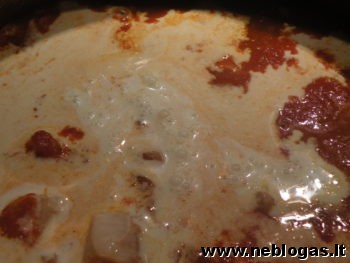 Į puodą dedame vieną vidutinio dydžio susmulkintą svogūną, jį pakepiname ant sviesto. Ant viršaus verčiame pakepintą vištieną, kelias smulkinto česnako skilteles, ten pat beriame porą šaukštelių saldžios paprikos miltelių, šaukštelį aštrios paprikos, pusantro šaukštelio raudonos arba žalio kario pastos, pilame vieną skardinę smulkintų pomidorų, trejetą šaukštelių “Garam masala” prieskonių, druskos pagal skonį. Patroškiname dešimt minučių ir įpilame vieną stiklinę grietinėlės.. Troškiname apie 30 minučių.